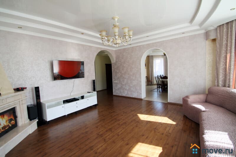Просторная гостиная с большим диваном, музыкальной акустикой, ТВ и камином (декоративным).